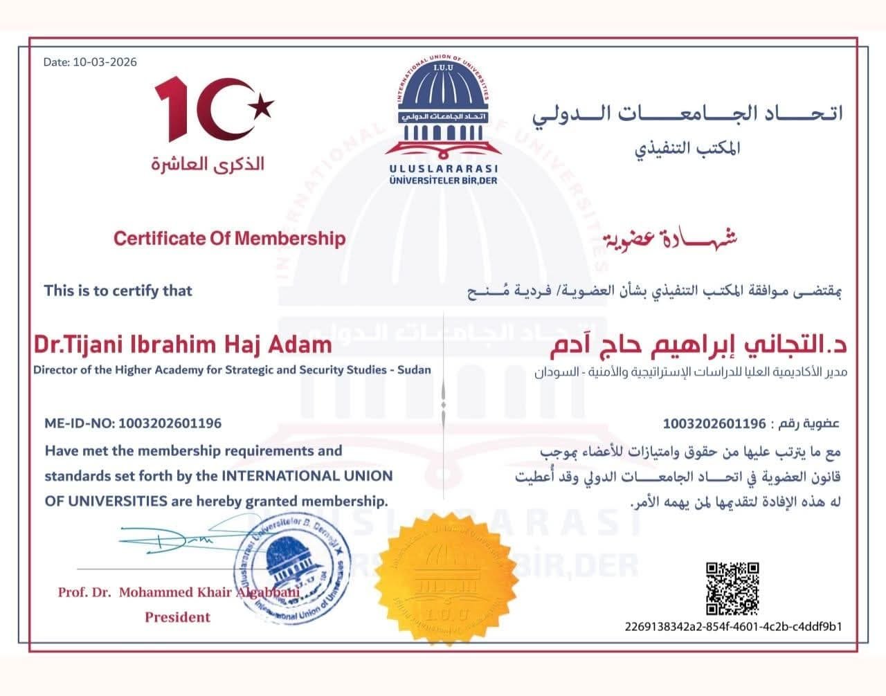 اللواء أمن الدكتَور التجاني ابراهيم حاج ادم مدير الاكاديمية العليا للدراسات الإستراتيجية والأمنية عضوا في اتحاد الجامعات الدولي.عضوية جديدة : رقم : ( 1750 )أخبار: International Union of Universities – اتحاد الجامعات الدولي : 2026 م.يبارك الاتحاد للواء الدكتور التجاني ابراهيم حاج آدم / السودان_ مدير الاكاديمية العليا للدراسات الإستراتيجية والأمنية في السودانانضمامه لعضوية اتحاد الجامعات الدولي.…..