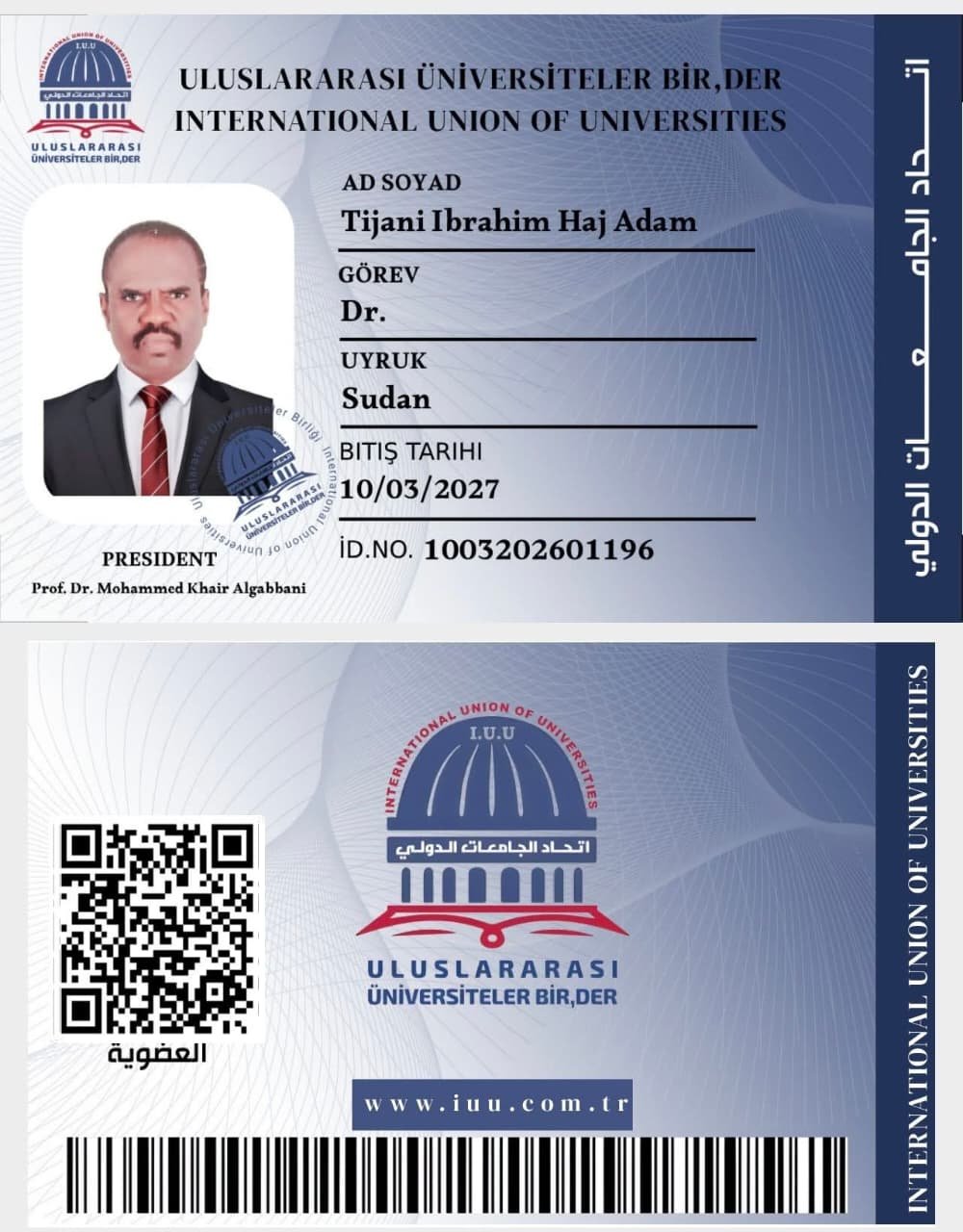 اللواء أمن الدكتَور التجاني ابراهيم حاج ادم مدير الاكاديمية العليا للدراسات الإستراتيجية والأمنية عضوا في اتحاد الجامعات الدولي.عضوية جديدة : رقم : ( 1750 )أخبار: International Union of Universities – اتحاد الجامعات الدولي : 2026 م.يبارك الاتحاد للواء الدكتور التجاني ابراهيم حاج آدم / السودان_ مدير الاكاديمية العليا للدراسات الإستراتيجية والأمنية في السودانانضمامه لعضوية اتحاد الجامعات الدولي.…..