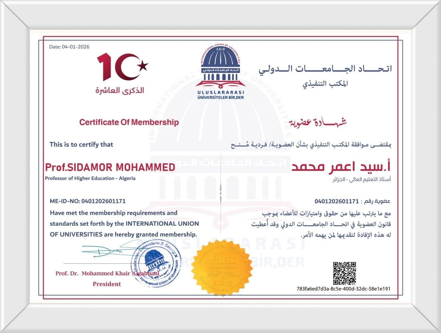 يبارك #اتحــــادالجامعــــاتالدولــــي للأستاذ الدكتور سيد اعمر محمد / #الجزائر