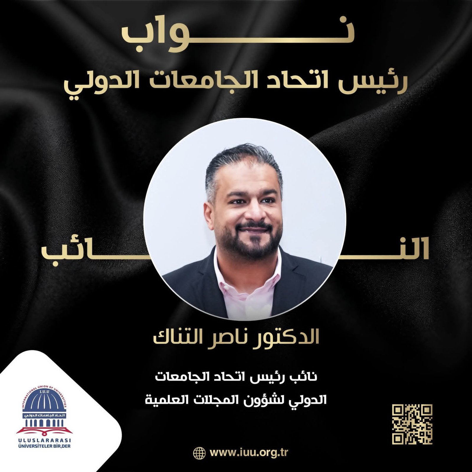 يبارك اتحاد الجامعات الدولي تعيين الدكتور ناصر التناك من دولة الكويت نائبًا لرئيس اتحاد الجامعات الدولي لشؤون المجلات العلمية، متمنين له التوفيق والنجاح في أداء مهامه، والمساهمة في تطوير البحث العلمي والارتقاء بالمجلات الأكاديمية وتعزيز حضورها في الساحة العلمية الدولية.كما نعرب عن ثقتنا بأن خبرته العلمية في المجلات والبحث العلمي والأكاديمية ستشكل إضافة نوعية لمسيرة الاتحاد وخدمةً للعلم والتعليم العالي.….