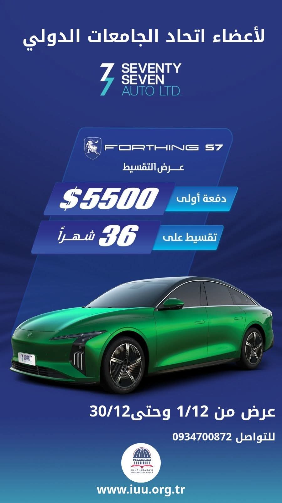 يسرّ اتحاد الجامعات الدولي أن يقدّم ولأول مرة في سوريا ميزة حصرية لأعضائه الكرام:برنامج الحصول على سيارات كهربائية بالتقسيط، ضمن مبادرة تهدف إلى دعم الاستدامة البيئية، وتوفير حلول نقل حديثة وموفرة للطاقة، وبشروط ميسّرة تلائم أعضاء الاتحاد من الأكاديميين والإداريين. تأتي هذه الخطوة انسجاماً مع رؤية الاتحاد في تعزيز الابتكار وتبنّي التقنيات الخضراء، وتقديم مزايا نوعية تواكب التطور العالمي في مجال النقل المستدام.
