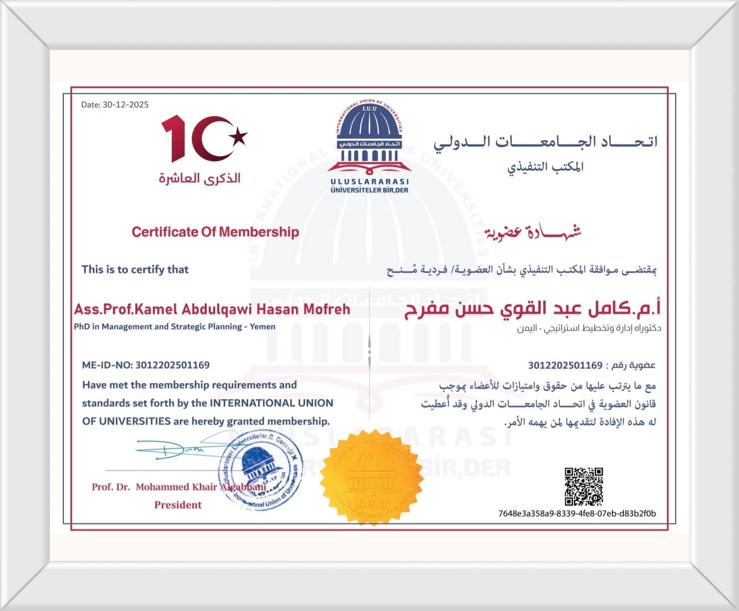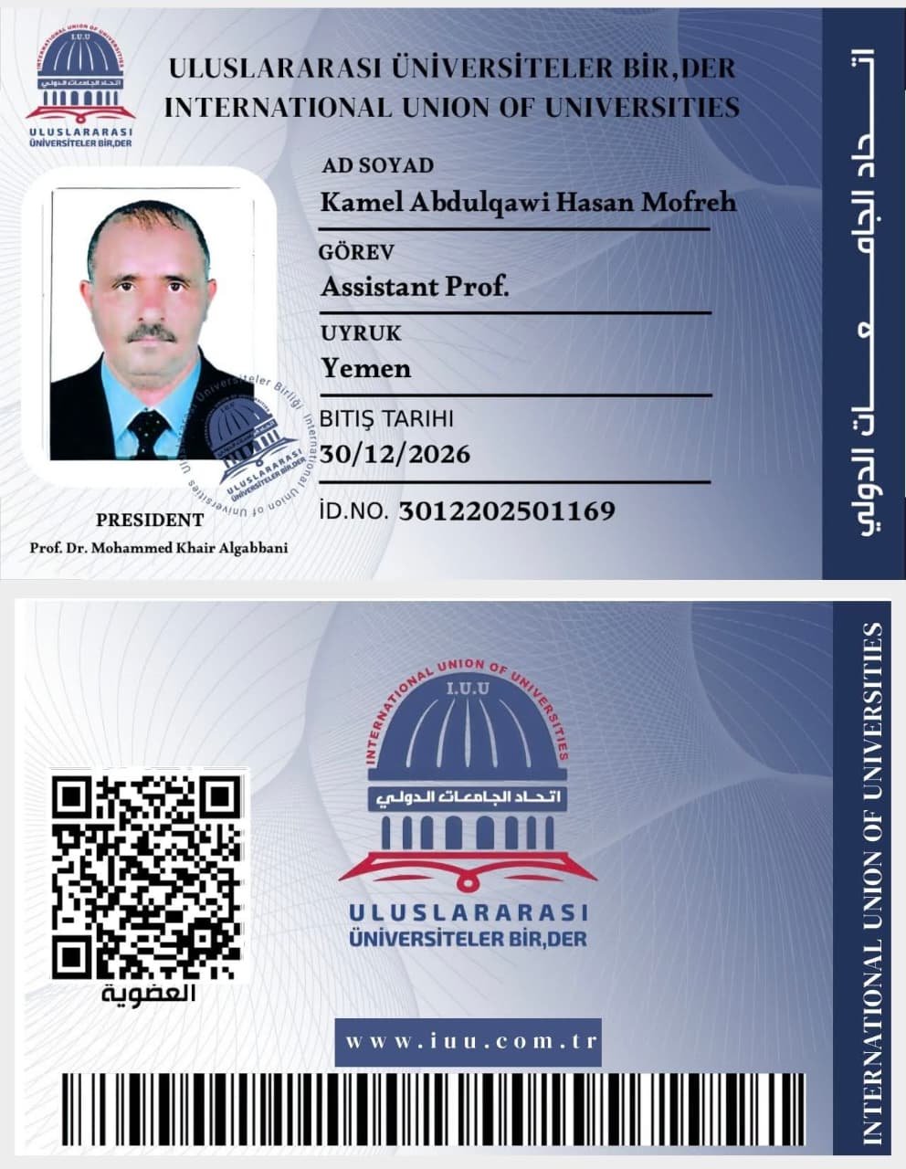 العضوية الأولى في عام : 2026 م تحت رقم / 1726|| عـضــويــة جــديــدة ||عضوية رقم ( 1726 )*يبارك #اتحــــادالجامعــــاتالدولــــي للأستاذ المساعد الدكتور كامل عبد القوي حسن مفرح / اليمن_ دكتوراه ادارة وتخطيط استراتيجي._ محاضر في جامعة الحديدة الحكومية.