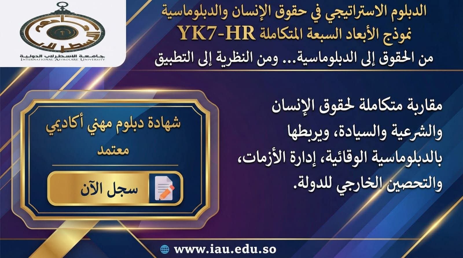 برعاية اتحاد الجامعات الدولي تعلن جامعة الاسطرلاب الدولية I.A.U عن طرح الدبلوم الاستراتيجي في حقوق الإنسان والدبلوماسية وفق نموذج الأبعاد السبعة المتكاملة (YK7-HR)برنامج أكاديمي متخصص يهدف إلى بناء الكفاءات العلمية والعملية في مجالي حقوق الإنسان والدبلوماسية، من خلال الربط بين الأسس النظرية والتطبيقات العملية، بما يواكب المتغيرات الدولية ويعزز الفهم الاستراتيجي المعاصر.من الحقوق إلى الدبلوماسية…