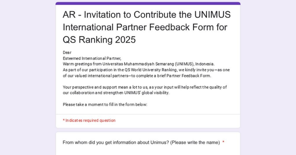 السلام عليكم ورحمة الله وبركاتهالدكتور المحترم، السادة أعضاء International Union of Universities – اتحاد الجامعات الدولي في إطار مشاركة الجامعة الاحمدية في إندونيسيا بتصنيف QS العالمي للجامعات، يسرّنا أن ندعوكم — بصفتكم أحد شركائنا الدوليين الكرام — إلى التكرّم بتعبئة نموذج موجز لتقييم الشركاء في الوقت الذي ترونه مناسبًا. وتُعدّ مشاركتكم ذات أهمية كبيرة لدعم هذه المبادرة الأكاديمية. شاكرين ومقدّرين لكم وقتكم الكريم وتعاونكم البنّاء.جزاكم الله خيرًا،وتفضلوا بقبول فائق الاحترام.