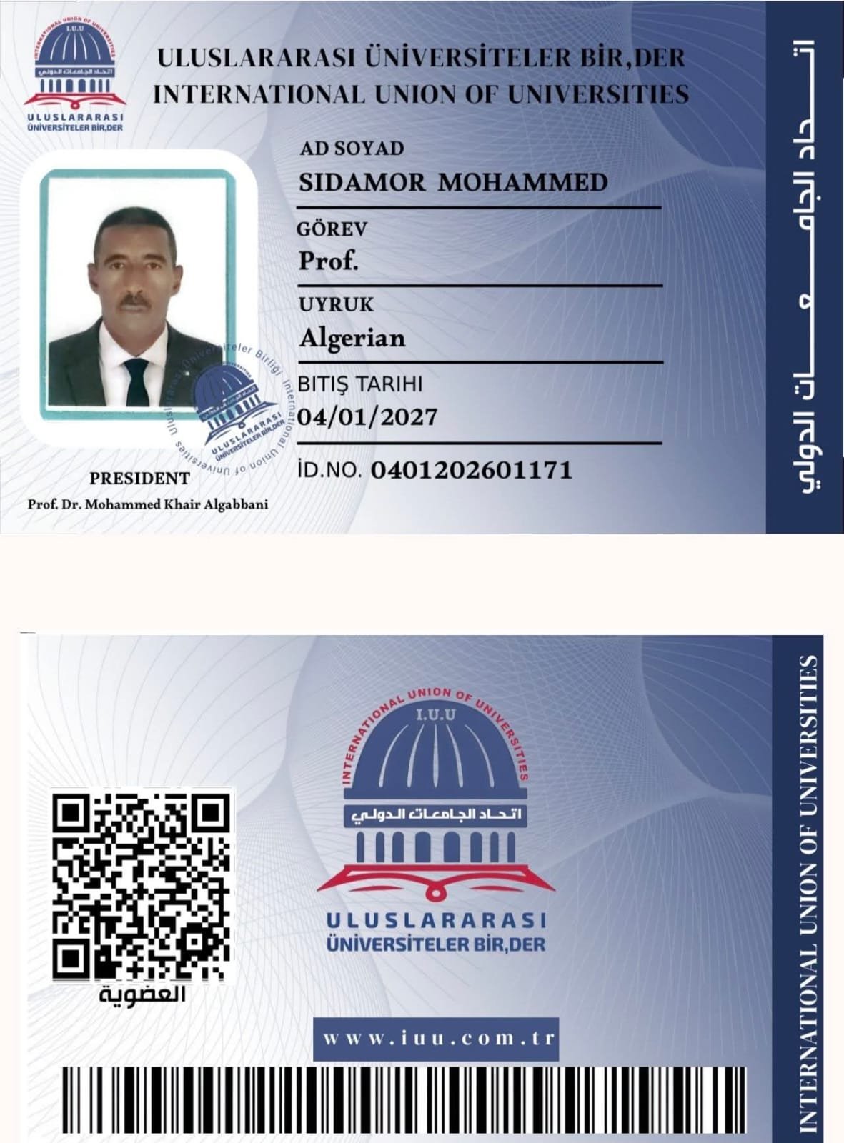 عضوية رقم ( 1728 )يبارك #اتحــــادالجامعــــاتالدولــــي للأستاذ الدكتور سيد اعمر محمد / #الجزائر_ أستاذ التعليم العالي._ كلية الحقوق والعلوم السياسية جامعة غرداية._ شهادة الدكتوراه تخصص قانون خاص._ شهادة الكفاءة المهنية للمحاماة : جامعة ألسانيا وهران.انـضـمــامــه كــ عــضــو فــي الاتـحـــاد
