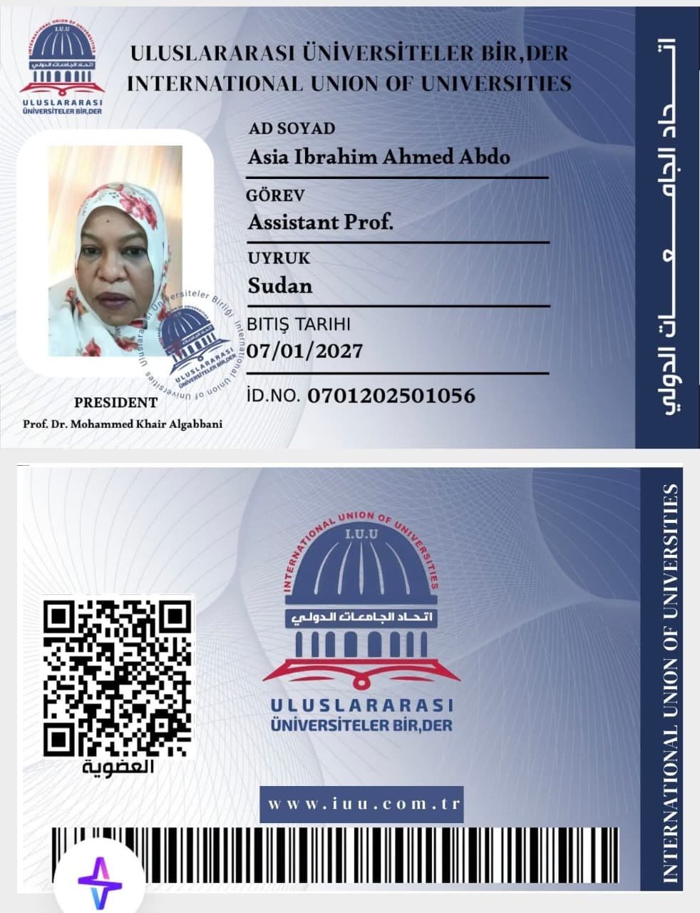 يـبـارك International Union of Universities – اتحاد الجامعات الدولي . للأستاذ المساعد الدكتور آسيا ابراهيم احمد عبدو / السودان_ دكتور محاضرتجديد عضويتها فـي الاتـحـاد*