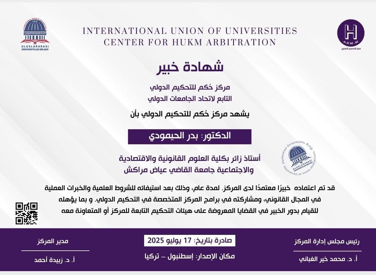 يتقدم International Union of Universities – اتحاد الجامعات الدولي ومركز حكم للتحكيم الدولي بأسمى آيات التهنئة والتبريك إلى الدكتور بدر الحمّودي