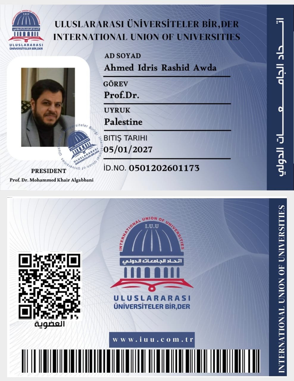 أخبار International Union of Universities – اتحاد الجامعات الدولي : 2026 م.يبارك الاتحاد للأستاذ الدكتور أحمد ادريس رشيد عودة #فلسطين_ أستاذ الحديث الشريف._ عضو مجلس البحث العملي والدراسات العليا._ رئيس تحرير مجلة الجامعة الإسلامية. انضمامه لعضوية اتحاد الجامعات الدولي.……….للإنضمام لعضوية الاتحاد التواصل مع مسوؤل مكتب العضويات لمتابعة اجراءاتكم: