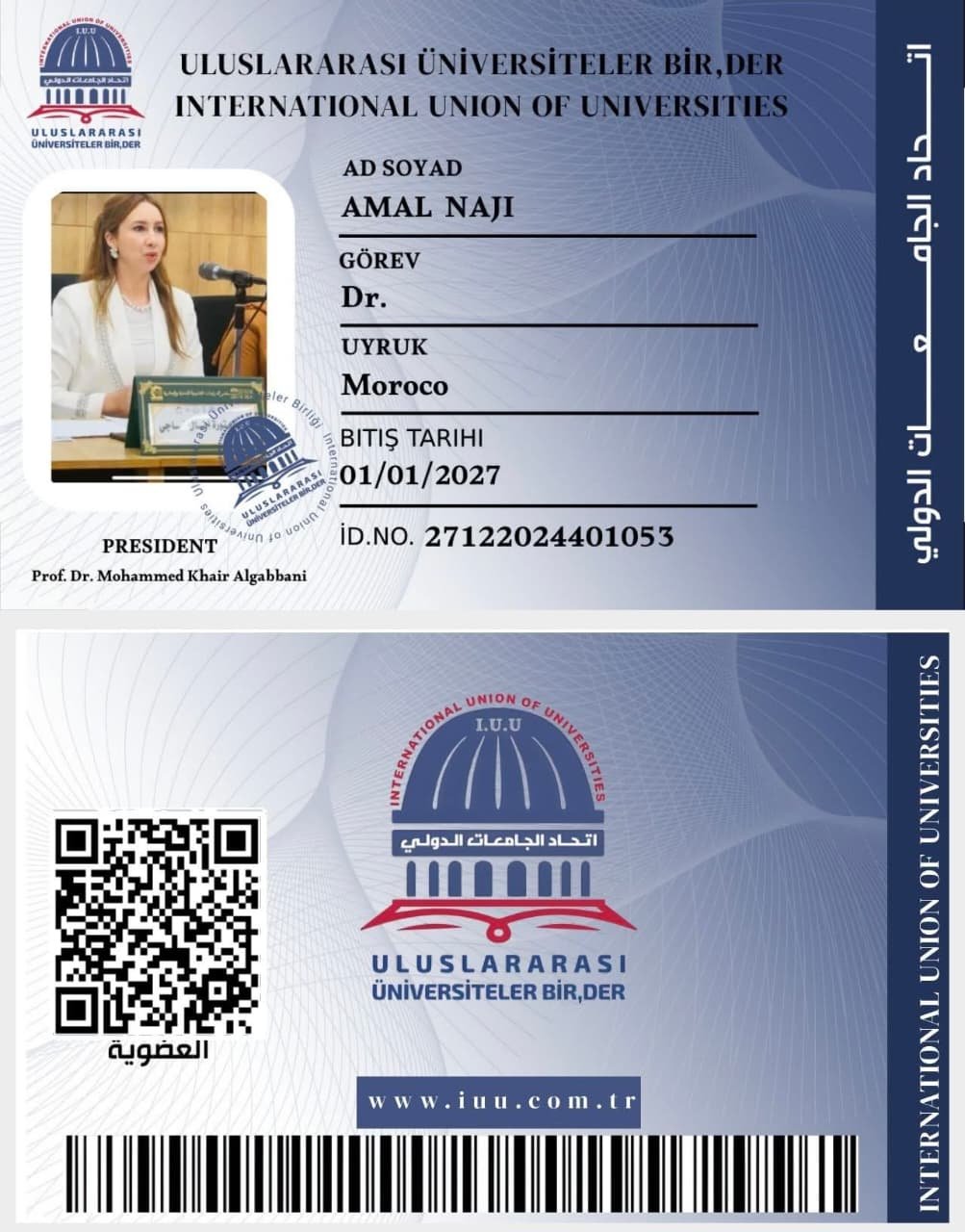 يـبـارك اتـحــاد الـجـامـعــات الــدولـــي لـــ لدكتورة امل ناجي #المملكةالمغربية_ دكتوراه في القانون ._ أستاذة ومحاضرة جامعية في جامعة محمد الأول بمدينة وجدة المغربية. تجديد عضويتها فـي الاتـحـاد*
