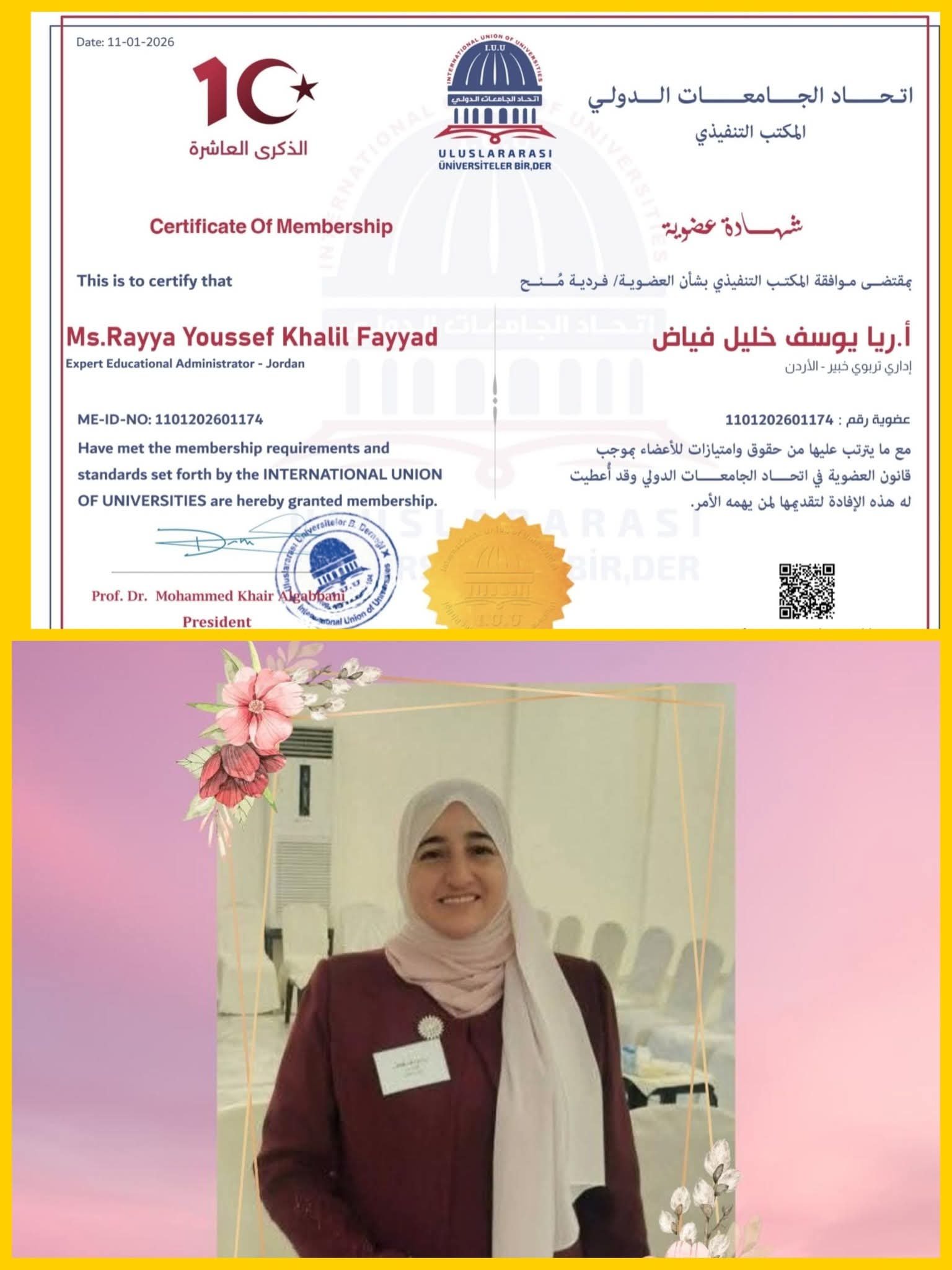 أخبار International Union of Universities – اتحاد الجامعات الدولي : 2026 م.يبارك الاتحاد للأستاذة الدكتور ريا يوسف خليل فياض / المملكة الاردنية الهاشمية._ ماجستير في الادارة التربوية جامعة اليرمرك._ مديرة مدرسة وعضو هيئة تدريس انضمامها لعضوية اتحاد الجامعات الدولي.……….