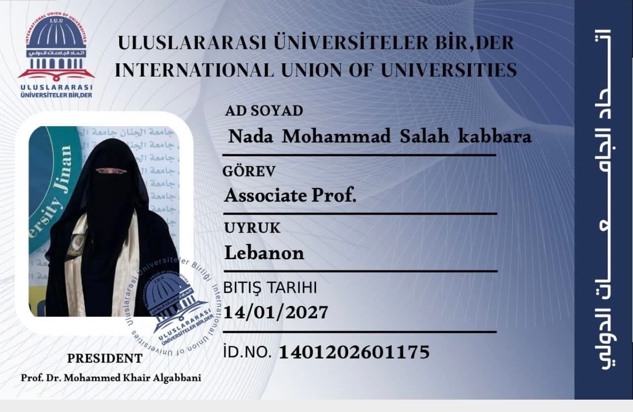 أخبار International Union of Universities – اتحاد الجامعات الدولي : 2026 م.يبارك الاتحاد للأستاذ المشارك الدكتور ندى محمد صلاح الدين كبارة / لبنان._ دكتوراه في الدراسات الإسلامية، تقدير ممتاز، جامعة الجنان، طرابلس-لبنان._ أستاذ محاضر :جامعة الجنان/طرابلس لبنان كلية الإمام الاوزاعي، بيروت_ الجامعة الاسلامية بمينيسوتا الأمريكية/ مكتب لبنان.أمين عام والمشرف على مركز خدمة القرآن الكريم، _ مجلس شيخ القراء محمد صلاح الدين كبارة للقراءات التابع لدار الفتوى في الجمهورية اللبنانية. مؤسس ورئيس أكاديمية الصلاح للتدريب والتطوير، علم وخبر رقم 1845/اد_ مؤسس ورئيس مركز الصلاح الخيري للإرشاد الأسري علم وخبر رقم 1021/ادانضمامها لعضوية اتحاد الجامعات الدولي.……….