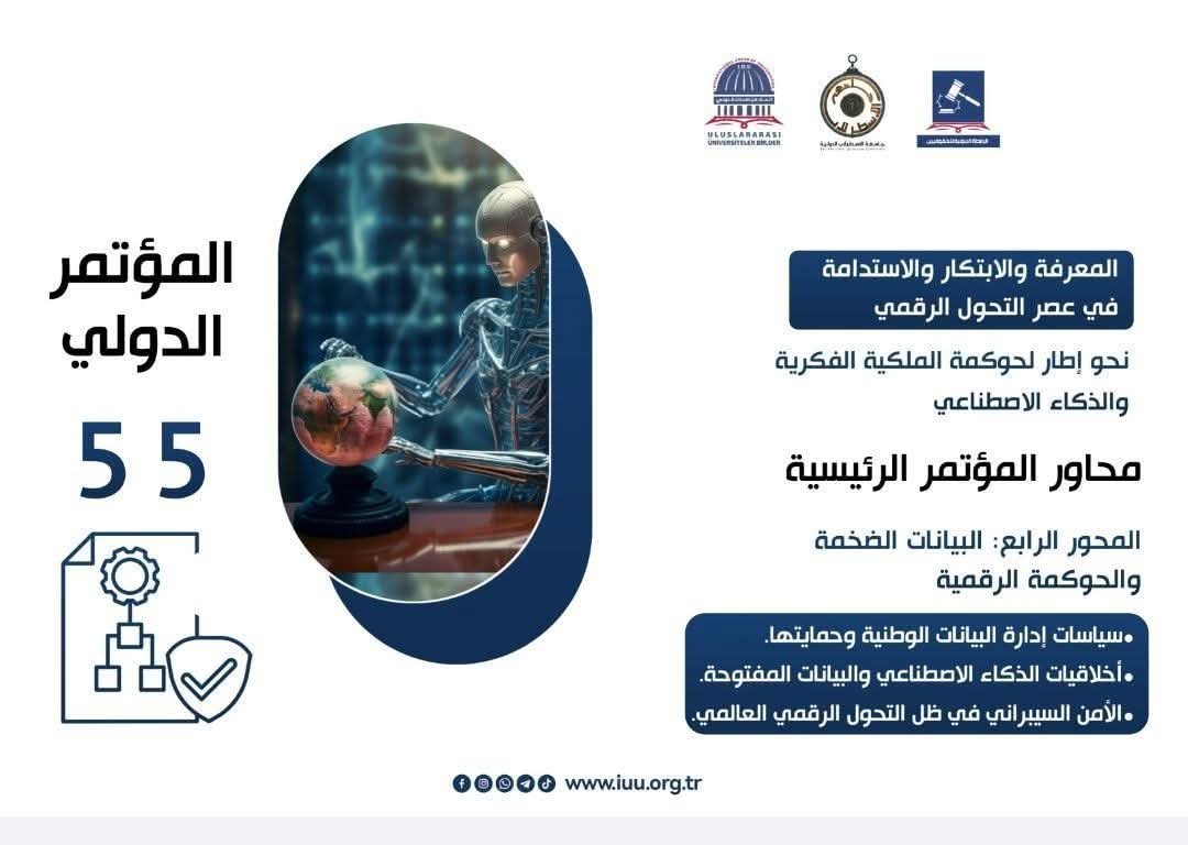 نحو إطار لحوكمة الملكية الفكرية والذكاء الاصطناعي.محاور المؤتمر الرئيسيةالمحور الرابع: البيانات الضخمة والحوكمة الرقميةيُعنى هذا المحور بمناقشة القضايا المعاصرة المرتبطة بإدارة البيانات والتحول الرقمي، ويسلط الضوء على الأطر التنظيمية والأخلاقية والتقنية التي تحكم استخدام البيانات والذكاء الاصطناعي في العصر الحديث، وذلك من خلال المحاور الفرعية التالية:سياسات إدارة البيانات الوطنية وآليات حمايتها.أخلاقيات الذكاء الاصطناعي والبيانات المفتوحة.الأمن السيبراني في ظل التحول الرقمي العالمي.بتاريخ : من 3 إلى 4 / 4 / 2026