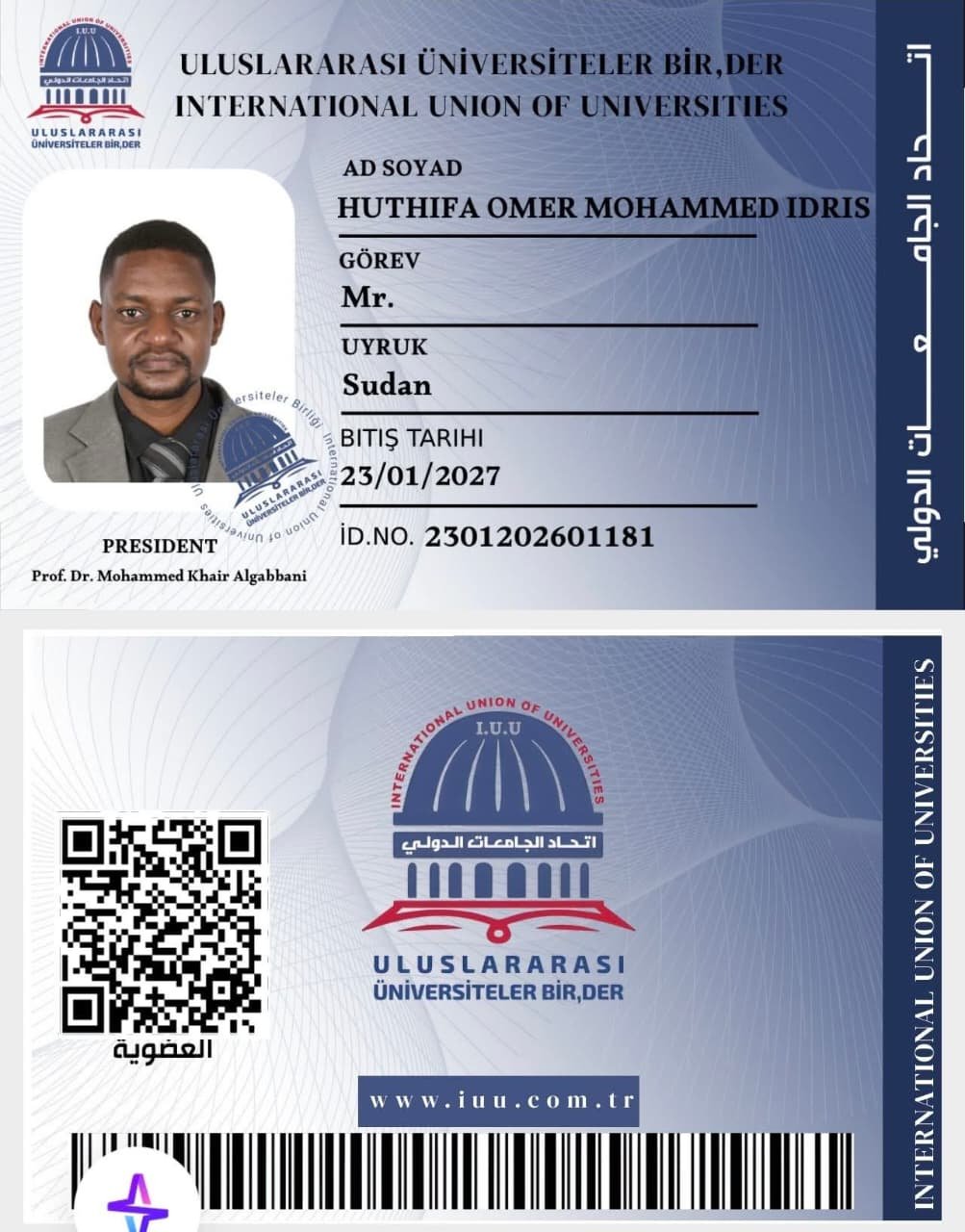 أخبار: International Union of Universities – اتحاد الجامعات الدولي : 2026 م.يبارك الاتحاد للأستاذ حذيفة عمر محمد إدريس._ ماجستير في الترجمة جامعة السودان._ ماجستير في العلوم السياسية._ أستاذ مساعد تدريس اللغة الانجليزية.