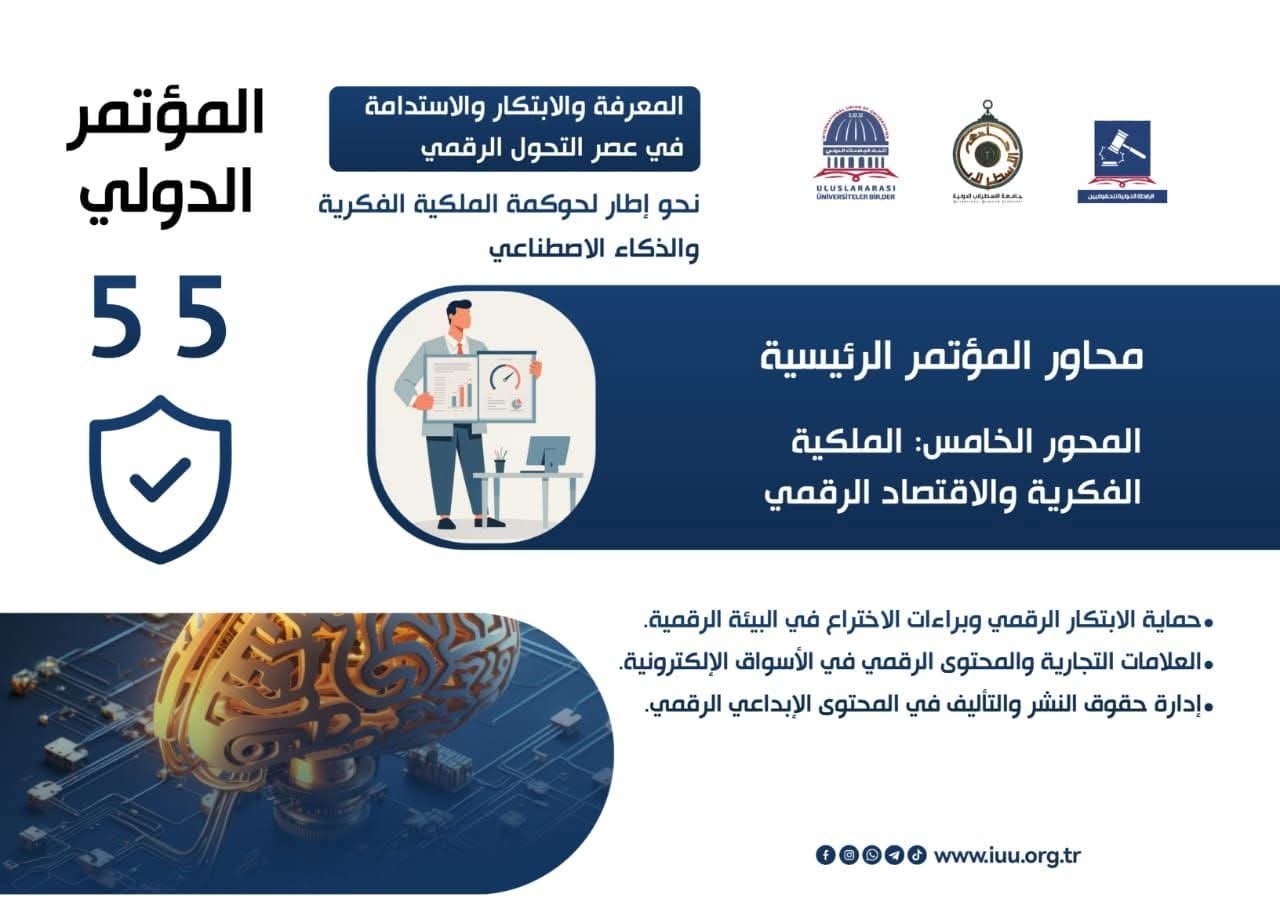 برعاية International Union of Universities – اتحاد الجامعات الدولي تدعوكم جامعة الاسطرلاب الدولية I.A.Uللمشاركة في المؤتمر الدولي الخامس والخمسين بعنوان : المعرفة والابتكار والاستدامة في عصر التحول الرقمينحو إطار لحوكمة الملكية الفكرية والذكاء الاصطناعي.محاور المؤتمر الرئيسيةالمحور الخامس: الملكية الفكرية والاقتصاد الرقمي.بتاريخ : من 3 إلى 4 / 4 / 2026….