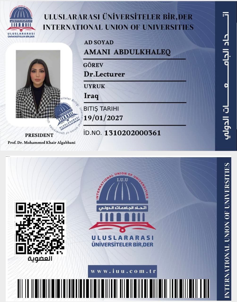 يـبـارك اتـحــاد الـجـامـعــات الــدولـــي للدكتورة أماني عبد الخاق / العراق_ أستاذة جامعية كلية الآداب الجامعة العراقية._ عضو International Union of Universities – اتحاد الجامعات الدولي. / تجديد عضويتها فـي الاتـحـاد*
