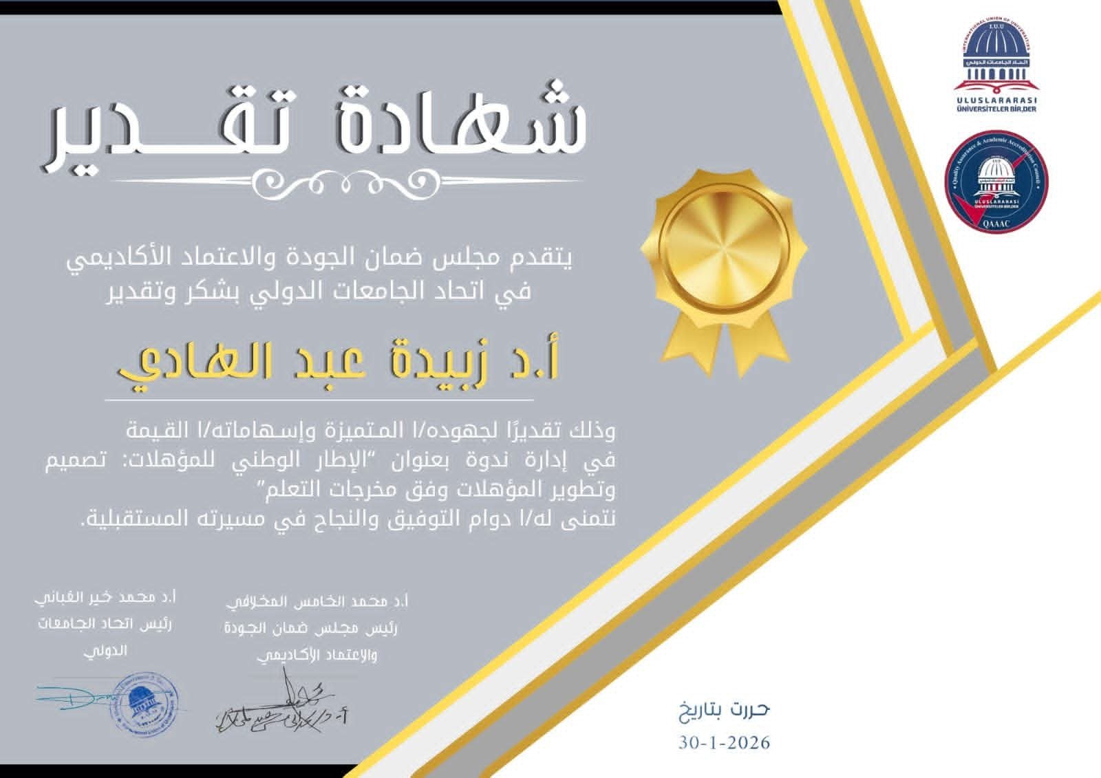 يتقدم مجلس ضمان الجودة والاعتماد الأكاديميفي اتحاد الجامعات الدولي بشكر وتقديرأ.د زبيدة عبد الهادي وذلك تقديراً لجهودها المتميزة وإسهاماتها القيمة في إنجاحها وتقديمها لندوة”الإطار الوطني للمؤهلات: تصميم وتطوير المؤهلات وفق مخرجات التعلم”نتمنى لها دوام التوفيق والنجاح في مسيرتها المستقبلية.….