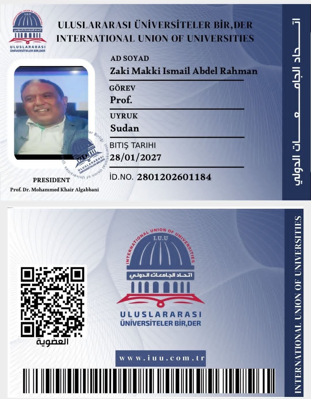أخبار: International Union of Universities – اتحاد الجامعات الدولي : 2026 م.يبارك الاتحاد للأستاذ الدكتور زكي مكي اسماعيل عبد الرحمن ._ استاذ ادارة الاعمال (بروفيسور) منذ العام 2014م بجامعة النيلين – كلية التجارة متدرجا من استاذ مساعد الى استاذ مشارك الىبروفيسور خلال الفترة من2003 الى2023م وما زال لحين مغادرته السودان._ استاذ مساعد / مشارك ومؤسس لكليات العلوم الإدارية بجامعة وادي النيل (1994 – 1992م) ثم عميدا ومؤسسا لثم عميدا ومؤسسا لكلية العلوم الإدارية بجامعة السودان المفتوحة (2007 – 2003م) بالاعارة من جامعة النيلين_ أستاذ مشارك واستاذاً معاراً بالجامعات السعودية بجامعة نجران والباحة لـ (6 سنوات من 2017 – 2011م، نجران.انضمامه لعضوية اتحاد الجامعات الدولي.…..