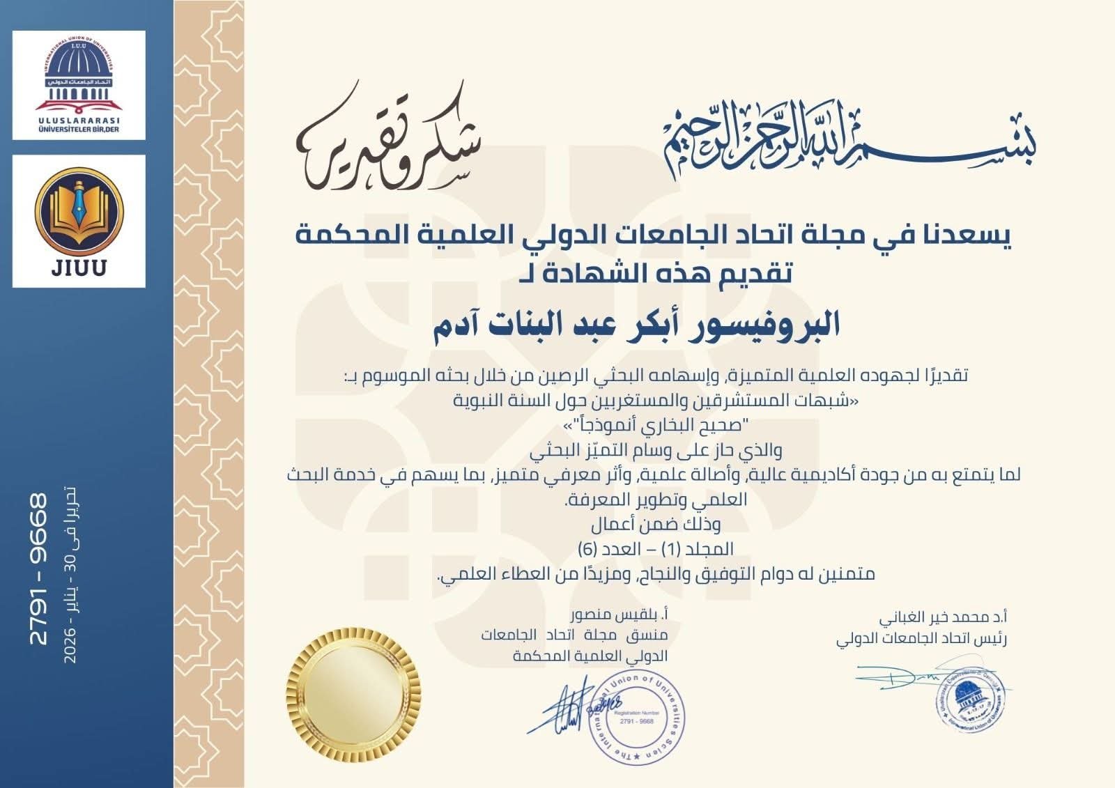 يسعدنا في مجلة اتحاد الجامعات الدولي العلمية المحكمة تقديم هذه الشهادة لـ البروفيسور ابكر عبد البنات تقديرًا لجهوده العلمية المتميزة، وإسهامه البحثي الرصين من خلال بحثه الموسوم بـ:«شبهات المستشرقين والمستغربين حول السنة النبوية “صحيح البخاري أنموذجاً”» والذي حاز على وسام التميّز البحثيلما يتمتع به من جودة أكاديمية عالية، وأصالة علمية، وأثر معرفي متميز، بما يسهم في خدمة البحث العلمي وتطوير المعرفة.وذلك ضمن أعمالالمجلد (1) – العدد (6)متمنين له دوام التوفيق والنجاح، ومزيدًا من العطاء العلمي.