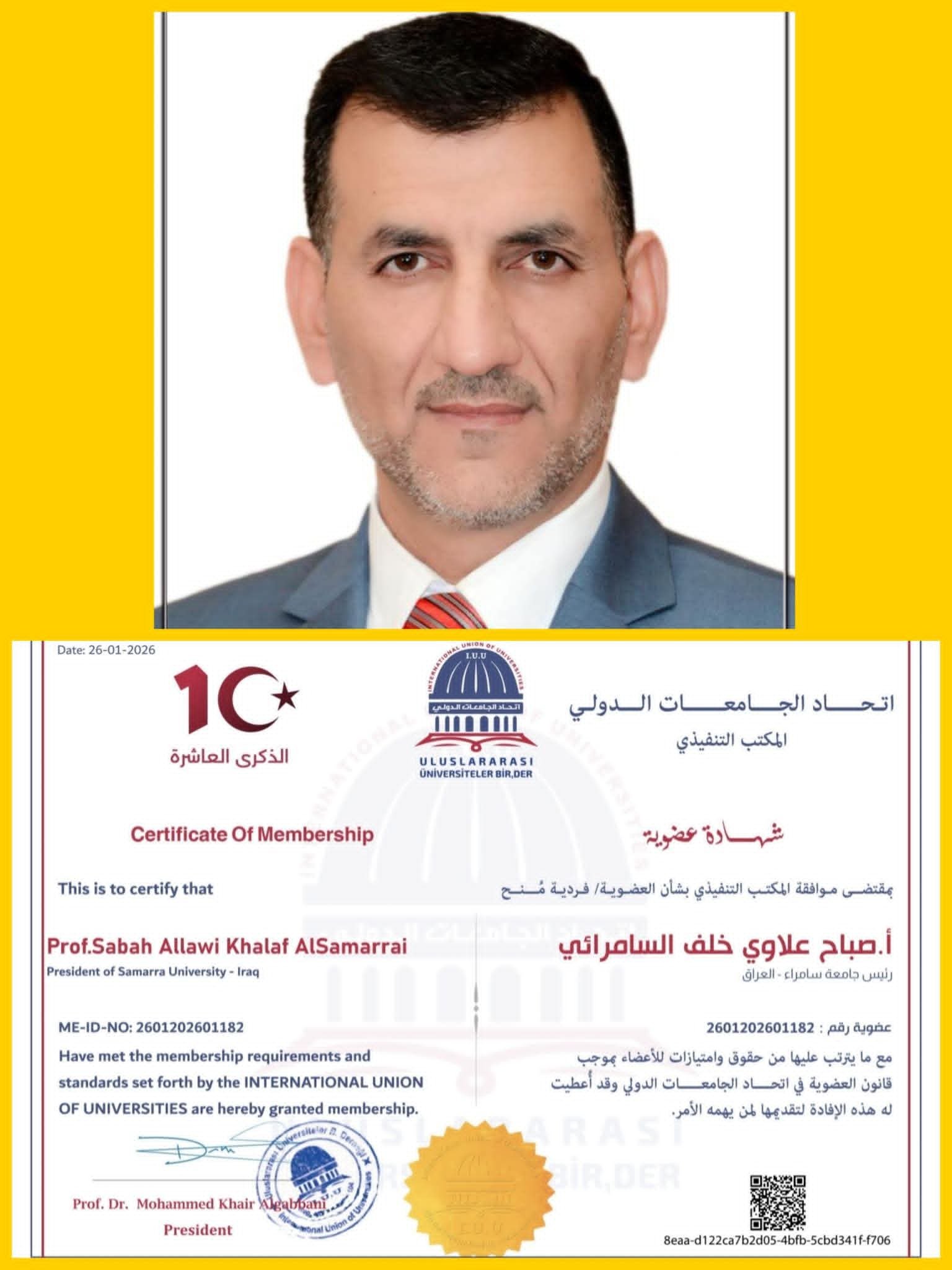 تـجــــديـــــد عـضــويــة ||*يـبـارك اتـحــاد الـجـامـعــات الــدولـــي للأستاذ الدكتور صباح خلف العلاوي السامرائي / العراق_ رئيس جامعة سامراء الحكومية_ عضو International Union of Universities – اتحاد الجامعات الدولي. / تجديد عضويته فـي الاتـحـاد*