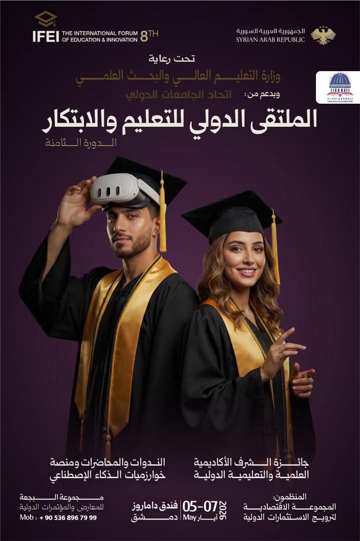 تحت رعاية وزارة التعليم العالي والبحث العلميوبدعم من: اتحاد الجامعات الدولي ندعوكم لحضور الملتقى الدولي للتعليم والابتكارالدورة الثامنة.برنامج الملتقي ._ معرض للجامعات_ الندوات والمحاضرات_ منصة خوارزميات الذكاء الاصطناعي_ جائزة الشرف الأكاديمية العلمية والتعليمية الدولية.من 5 إلى 7 / 4 ( ايار ) / 2026.العاصمة السورية دمشق.….