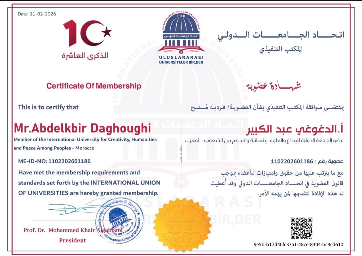 أخبار: اتحاد الجامعات الدولي : 2026 م.يبارك الاتحاد للسيد الدغوغي عبد الكبير / المملكة المغربية_ عضو جامعة المجتمع المدني المغربي._ رئيس الهيئة الوطنية لمغاربة العالم جهة الدار البيضاء.انضمامه لعضوية اتحاد الجامعات الدولي.…..