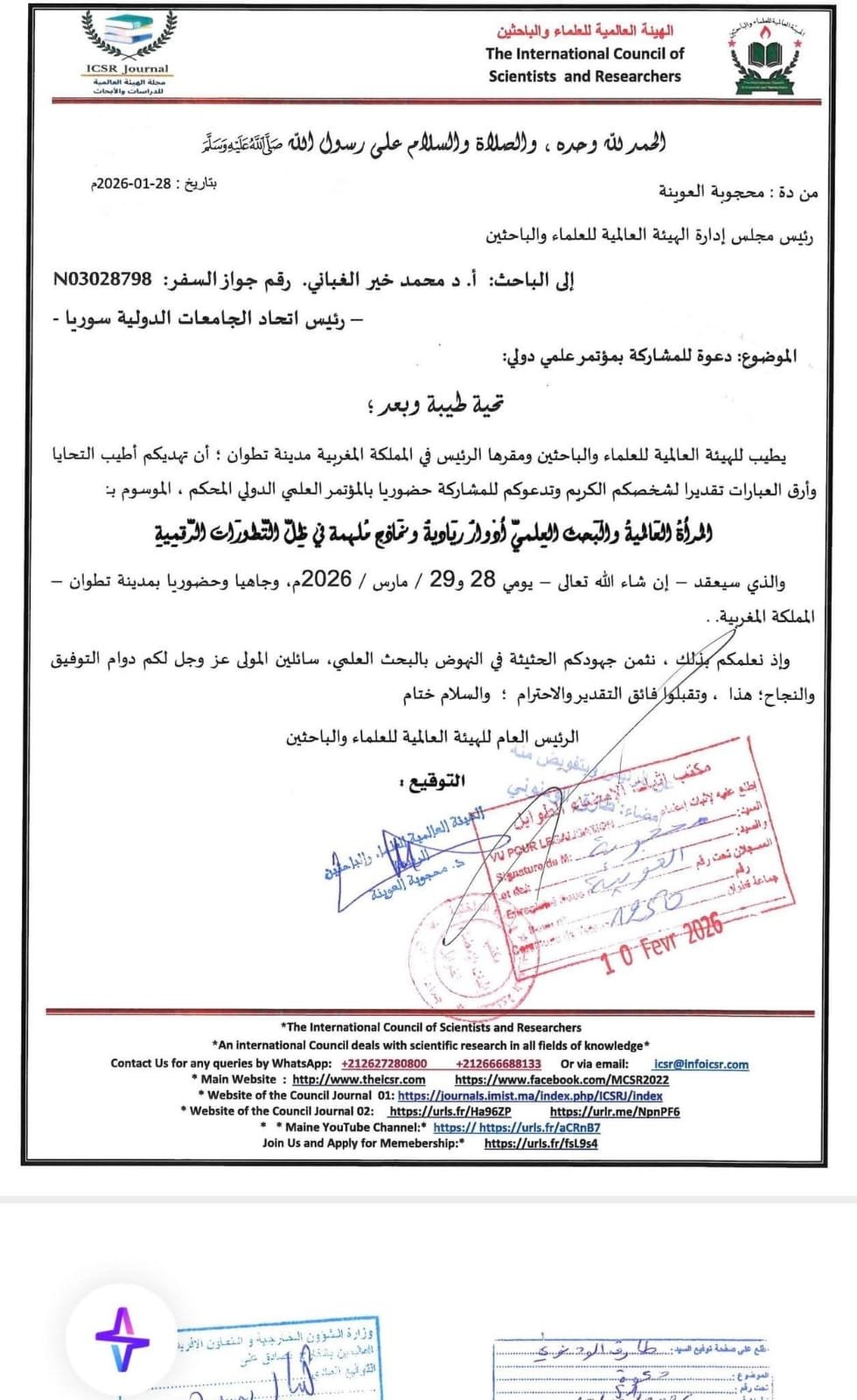 يتقدّم رئيس اتحاد الجامعات الدولي، البروفيسور الدكتور محمد خير الغباني الحسيني، بخالص آيات الشكر والتقدير إلى الهيئة العالمية للعلماء والباحثين في المملكة المغربية الشقيقة، وذلك على دعوتها الكريمة للمشاركة في المؤتمر العلمي الدولي، وما تعكسه هذه الدعوة من ثقةٍ علمية وتقديرٍ للدور الأكاديمي الذي يضطلع به الاتحاد في دعم البحث العلمي والتعاون الأكاديمي الدولي.وأكّد رئيس اتحاد الجامعات الدولي أن هذه المبادرات العلمية الرصينة تسهم في تعزيز الحوار الأكاديمي وتبادل الخبرات بين العلماء والباحثين من مختلف الدول، وتدعم مسارات التطوير والابتكار في المجالات العلمية والمعرفية.وأشار إلى أن المشاركة في هذا المؤتمر العلمي الدولي تمثّل إضافة نوعية لمسيرة التعاون العلمي المشترك، وتعكس أهمية العمل المؤسسي في الارتقاء بمستوى البحث العلمي وخدمة قضايا العلم والمعرفة على المستويين الإقليمي والدولي.وكما أعرب عن تقديره للجهود العلمية والتنظيمية المبذولة لإنجاح هذا الحدث الأكاديمي، متمنيًا للقائمين عليه دوام التوفيق والسداد، ومؤكدًا استمرار اتحاد الجامعات الدولي في دعم المبادرات العلمية الهادفة إلى خدمة الإنسانية وبناء مستقبل معرفي مستدام.