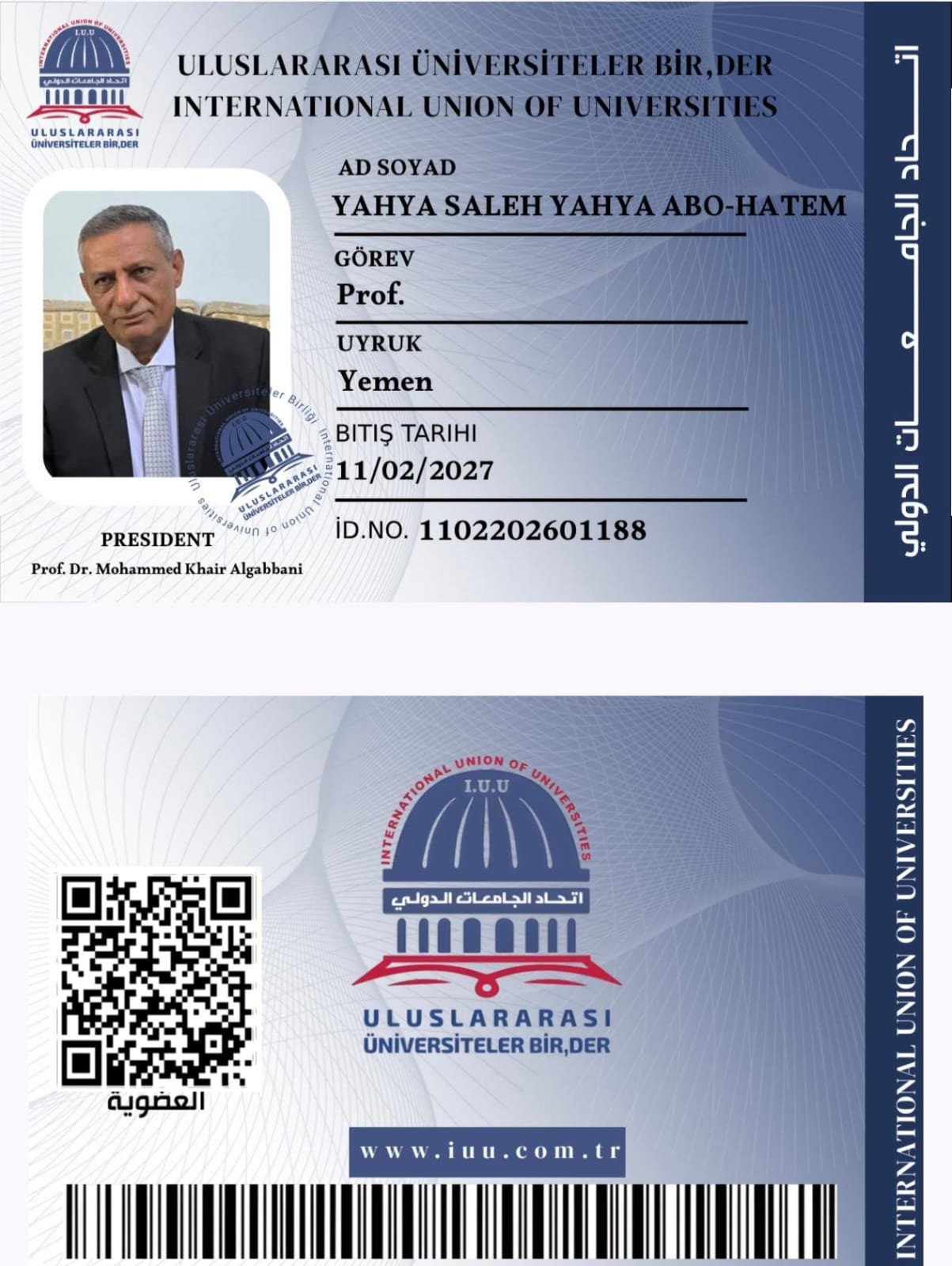 أخبار: اتحاد الجامعات الدولي : 2026 م.يبارك الاتحاد للدكتور يحيى صالح يحيى أبو حاتم/ اليمن_ دكتوراه في القانون الدولي الخاص من جامعة عين شمس – مصر.._ نائب رئيس جامعة العلوم الحديثة_ صنعاء اليمن.انضمامه لعضوية اتحاد الجامعات الدولي.…..للإنضمام لعضوية الاتحاد التواصل مع مسوؤل مكتب العضويات لمتابعة اجراءاتكم: