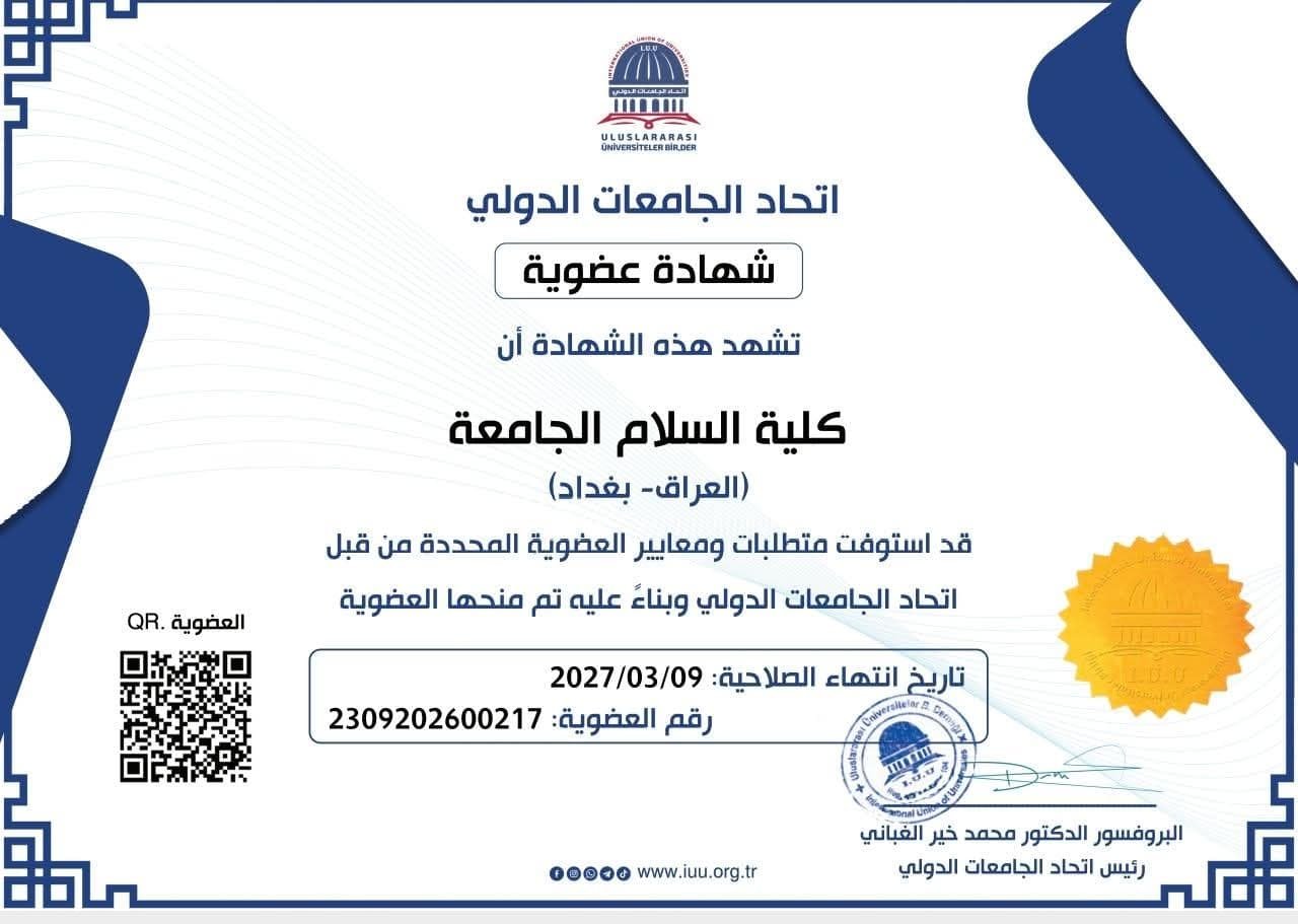 أخبار – #عضويات. || تجديد عضوية#العـــــــــــــــــــــراق *تجديد عضوية كلية السلام الجامعة / العراق– في اتحاد الجامعات الدولي. كلية السلام الجامعة كلية معترف بها من قبل وزارة التعليم العالي وتعد واحدة من اجمل وأقدم الكليات الأهلية في العراق وتضم 16 قسم علمي.